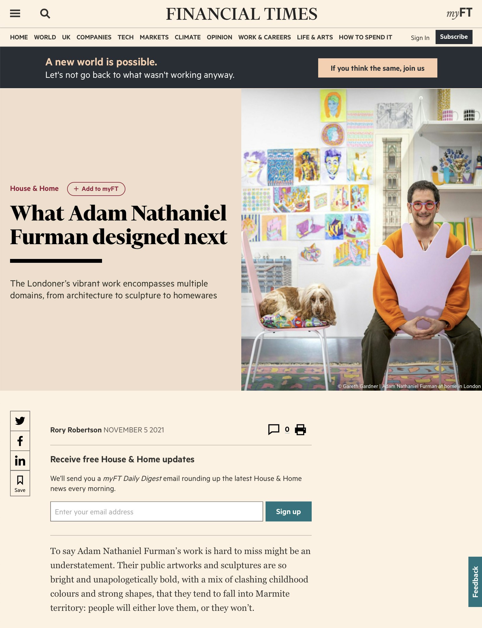 One of my portraits of artist/designer Adam Nathaniel Furman, along with an image of his recent Proud Little Pyramid project, were featured in a recent issue of the Financial Times.