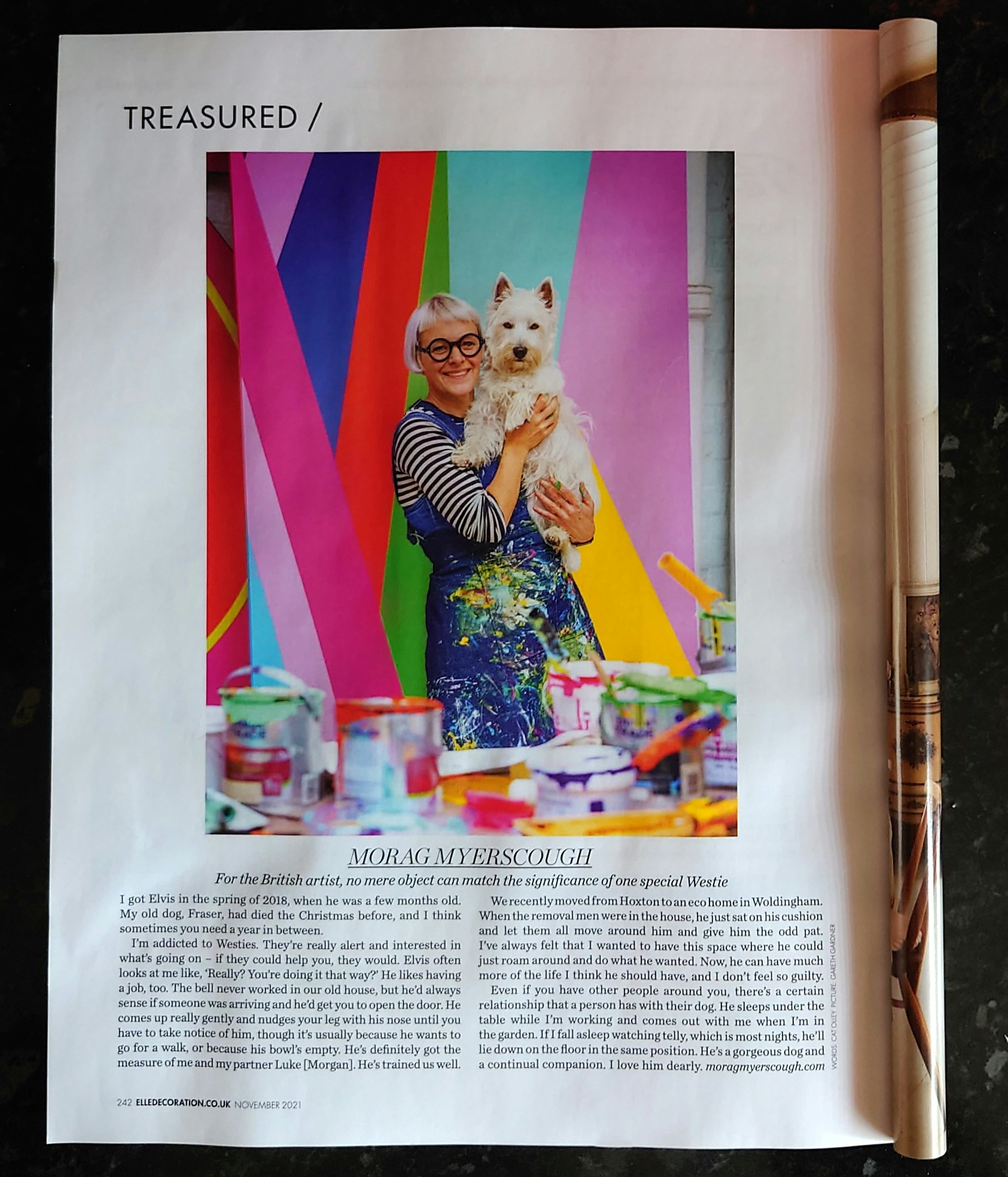 The latest issue of Elle Decoration (November 2020) features my recent portrait of artist Morag Myerscough. She was photographed at her former studio with her beloved Westie Elvis.