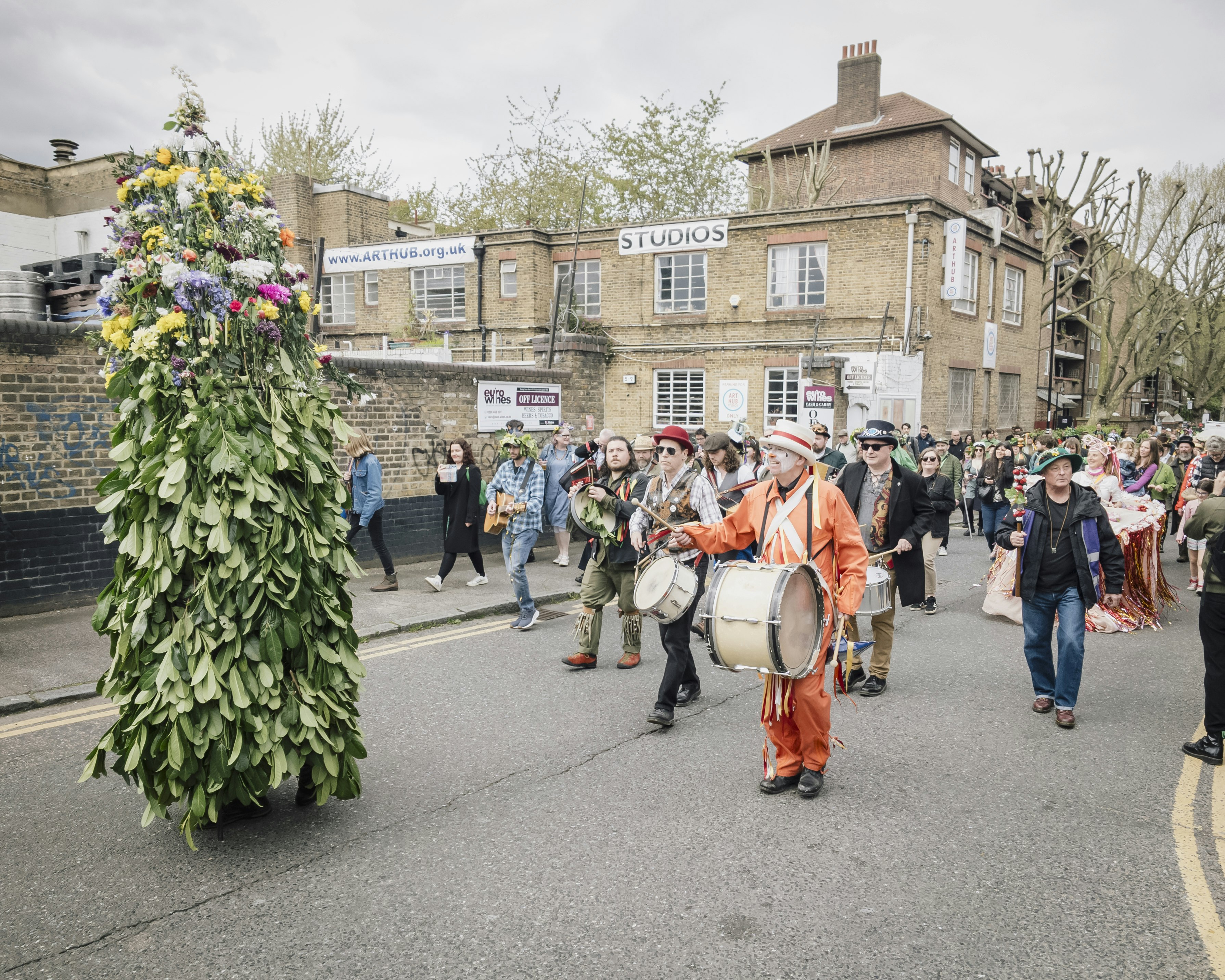On May 1st every year, a 3m-tall lattice structure festooned with sprigs of laurel and topped by a crown of spring flowers leads a parade around Deptford. It is accompanied by a huge crowd of attendants, musicians, morris men and folk dressed as sweeps, milkmaids, an Oss and various other characters, all dancing and playing to the beat of Tired Tim’s bass drum.