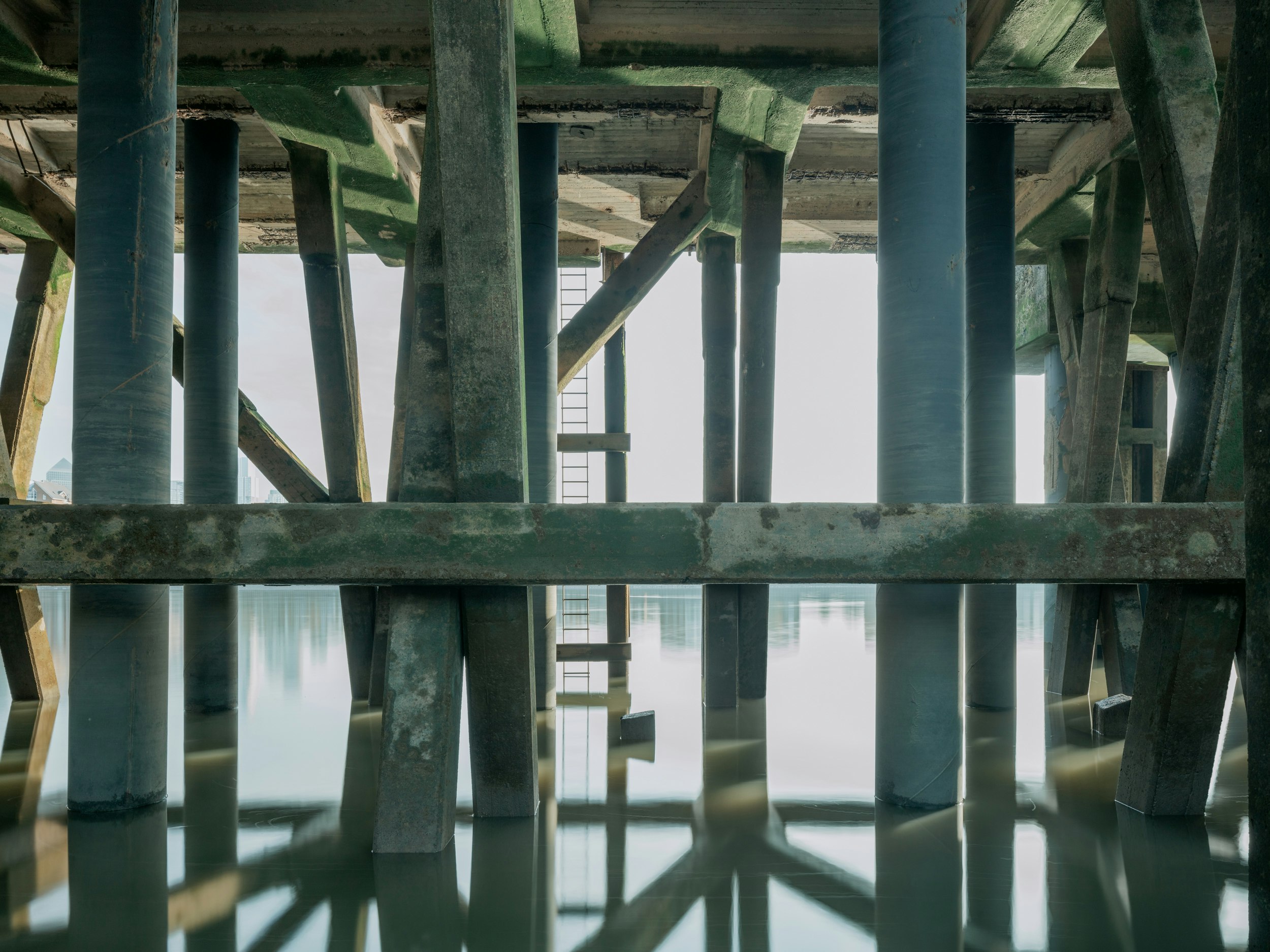 James began in early 2019 to explore the epic spaces underneath structures such as wharves and piers, revealed twice every day as the tide drops. He has captured these ‘tidal rooms’ from foreshore level, revealing their accidental yet powerful beauty. While the structures were designed solely to support activities above – such as loading and unloading ships – the spaces enclosed underneath are unwittingly majestic, often on a spectacular scale.