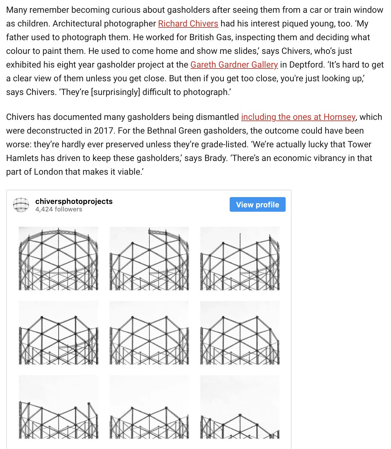Time Out recently published a major feature by Jessica Furseth about gasholders in London, and featured the photographic work of Richard Chivers. It was great to see the gallery name-checked in the piece.